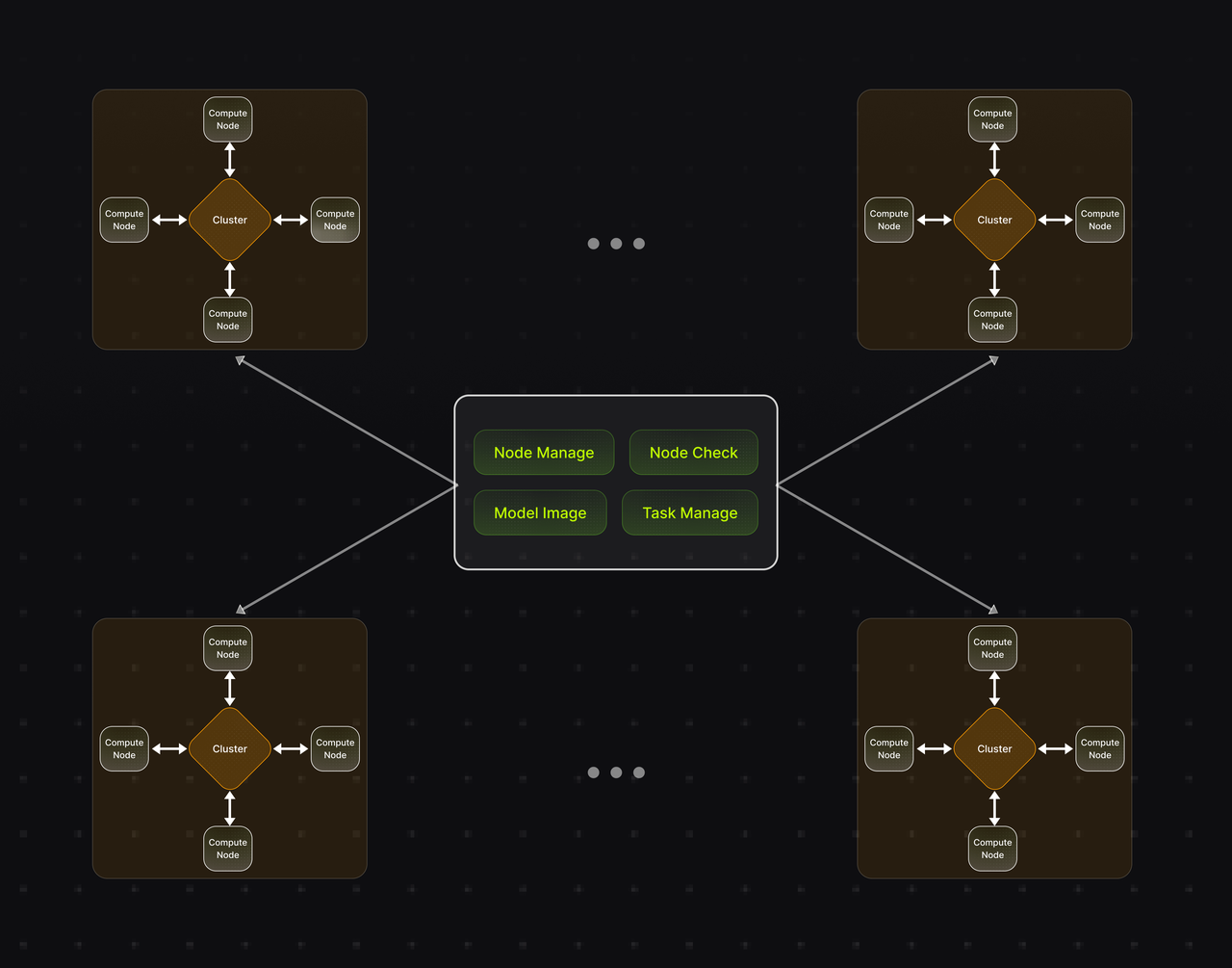 The  computational resources are managed and scheduled through a decentralized cluster system. Each compute node collaborates via the Lumoz chain, with decentralized protocols ensuring efficient communication and resource sharing between nodes.